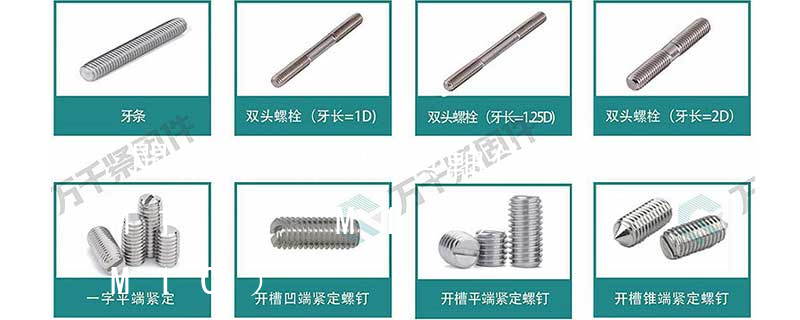 開槽 (圓柱頭 盤頭 沉頭 半沉頭)十字槽 (圓柱頭 盤頭 沉頭 半沉頭 小盤頭)B.緊定螺釘 (M1.6~M24)開槽 (錐端 平端 凹端 圓柱)內六角 (錐端 平端 凹端 圓柱)方頭(長圓柱球面 凹端 長圓柱 短圓柱