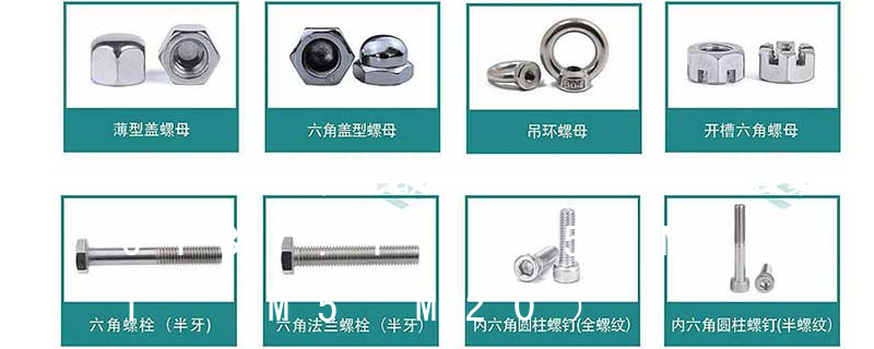 1型六角螺母:標準為GB/T 6170,螺紋規格為M1.6~M64、性能等級為6、8、10、A2-50、A2-70、A4-50、A4-70、CU2、CU3和AL4級、產品等級為A和B級的1型六角螺母。A級用于D≤16mm;B級用于D>16mm的螺母。2型六角 · 側面帶孔圓螺母GB 816-88 · 帶槽圓螺母GB 817-88 · 1型非金屬嵌件六角鎖緊螺母GB /T 889.1-2000 · 1型非金屬嵌件六角鎖緊螺母細牙GB /T 889.2-2000 · 蓋形螺母GB 923-88 · 1型六角螺母GB /T