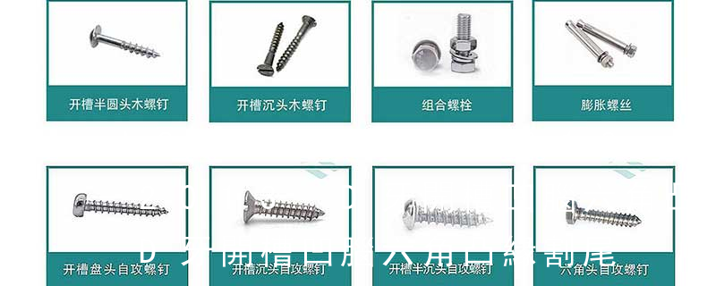 (鐵板牙自攻螺絲) B-2: Plastic Tapping Screw. (塑膠用,自攻螺絲) C: Wooden Screw : 木工螺絲 D: Drywall Screw :水泥墻螺絲 E: Self Drilling Screws鉆尾螺絲(不銹鋼鉆尾螺絲,復合材料鉆尾螺絲) F:膨脹螺絲,四片膨脹螺絲又
