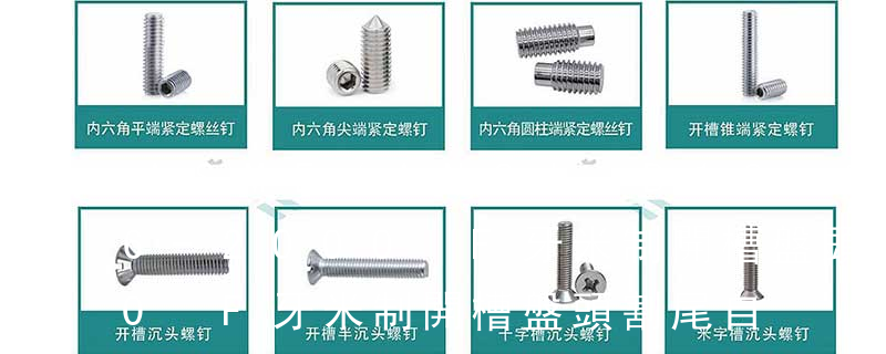 1.機螺釘 2.自攻螺釘 3.鉆尾螺釘 4.墻板釘 5.纖維板釘 6.木螺釘7.六角木螺釘 8.不脫出螺釘 9.組合螺釘 10.微型螺釘 11.家具螺釘 12.電子螺釘 13.鏈帶螺釘頭型:1.六角頭(hexagon head)2.六角頭法蘭面(hexagon head with